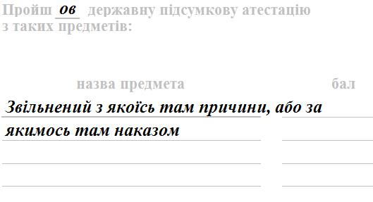 Тоді в програмі, після імпорту з оціночної відомості, Ви зможете ввести на цьому місці потрібний текст: "Звільнений" чи "На підставі ... звільнений від ..." чи ще щось (як вимагає місцеве начальство).